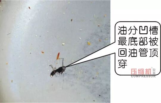 问题分析:回油管穿透油分底部钢板,这样就会形成一个旁通,致使部分油气混合物不经过油分,直接进入出气口造成机器跑油。